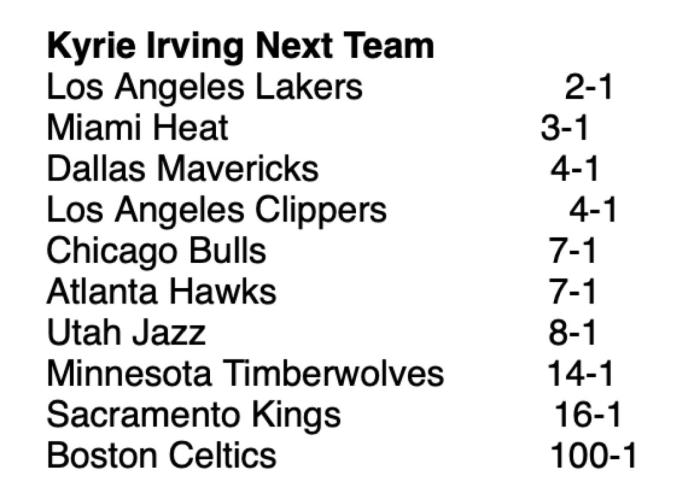在欧文潜在下家赔率上,湖人1赔2领跑,热火1赔3排在第二,独行侠1赔4排名第三,另外快船、公牛、老鹰、爵士以及凯尔特人等球队也在列。