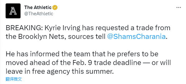 据名记Shams报道,欧文已经向篮网提出交易请求,欧文倾向于交易截止日前被交易,或者将会选择在今夏进入自由市场离开球队。