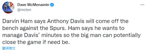湖人主帅哈姆表示浓眉将会替补出战,为了更好地管理他的上场时间,这是浓眉本赛季也是湖人生涯第一次替补出战,职业生涯地6次替补出战。