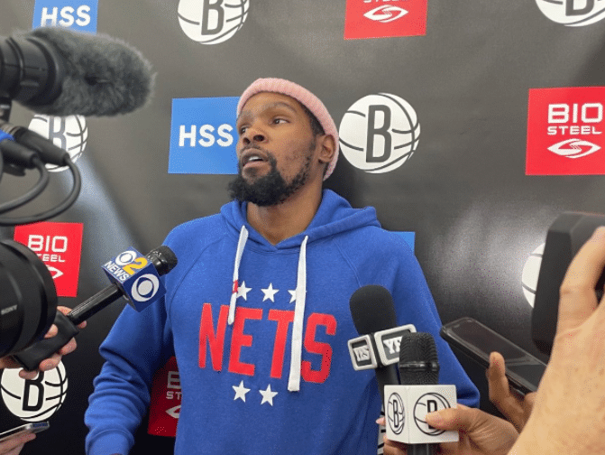 值得一提的是,杜兰特戴着一顶小粉帽接受采访,透露自己在家中都是静音观看篮网队的比赛,如此回答逗得现场记者哄堂大笑。