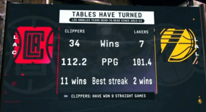 据统计,自12-13赛季起,湖人和快船已经打了41场洛城德比,快船在战绩上34胜7负占据压倒性优势,并且最近9场大战快船全胜;在这41场比赛中,快船场均得到112.2分,湖人得到101.4分,期间快船曾对湖人豪取11连胜。