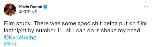 此前欧文投进8记三分狂砍48分11篮板6助攻,带领篮网击败爵士终结4连败,杜兰特转发欧文的个人视频集锦,并且配文写道:录像研究呢,看到11号这样的表现,我只能摇头惊叹!