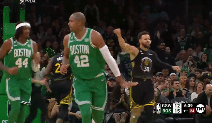 勇士变阵的最直观影响就是勇士内线被打爆,首节禁区得分2-20净输18分,不过绿军外线失准,单节三分7投1中,内线占优但第一节25-2仍落后1分,勇士第一节投进6记三分球。