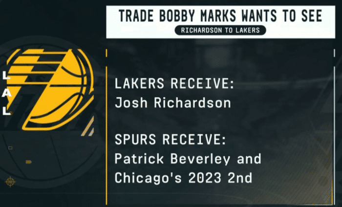 第一种交易方案:湖人送走贝弗利和2023年次轮签,从马刺得到约什-理查德森