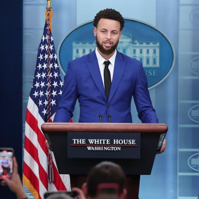 勇士全队都身穿正装前往白宫并且几乎都带着家人,不过还未成家的汤普森独自一人来到白宫,显得有些孤单;库里在西装外面加了一件大衣,带着妻子阿耶莎出席活动。