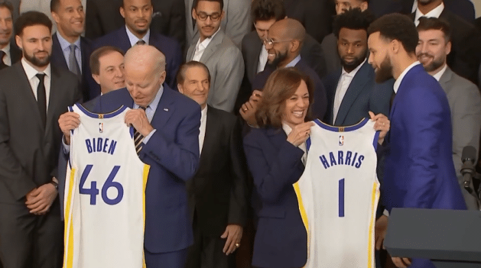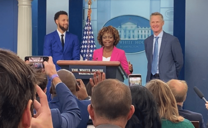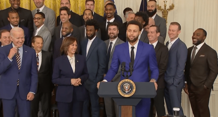 勇士全员来到白宫后,其他球员以及勇士老板和主帅都提前站在合影区,库里去哪儿了?库里获得特殊待遇,与总统拜登一起走过来,现场为他们鼓掌以及欢呼;来到发言台之后,库里当众讲话并且把勇士队46号球衣赠送给总统拜登,以及把1号球衣赠给副总统哈里斯。
