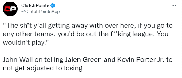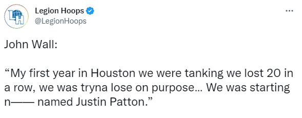 谈到火箭生涯,沃尔在节目中表示:我在火箭的第一年,我们在摆烂,球队连输20场比赛,我们就是在故意输球……我们首发了个什么贾斯汀-帕顿,还有什么大卫-恩瓦巴,杰西恩-泰特,还有一些有的没的再加上我,我当时的想法就是,哥们这跟我一块儿上场的都TM是谁啊!