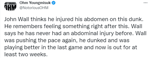 对于的自己的伤势,沃尔本人表示他是在对阵掘金的比赛中扣篮后感到腹部不适,沃尔表示:说实话,在过去的三年里,当有人和我竞争时,我从来没有像现在这样跳过,我想我只是在扣篮的时候过度伸展了。