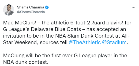来源:JRS直播网01-14 15:43JRS直播网讯01月14日讯 ,据名记shams报道,湖人旧将马克-麦克朗已经接受参加NBA扣篮大赛,麦克朗承诺参加扣篮大赛创造历史,成为史上第一位参加扣篮大赛的发展联盟球员;目前扣篮大赛4人名单已确定三席,另外两位参赛者是开拓者新秀夏普和火箭名宿之子小马丁。