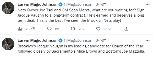 来源:JRS直播网01-12 10:27JRS直播网讯01月12日讯 ,湖人名宿魔术师约翰逊发推谈到篮网现状,表示篮网是凯尔特人进入总决赛的最大威胁,盛赞欧文并且呼吁篮网赶紧续约主帅沃恩。