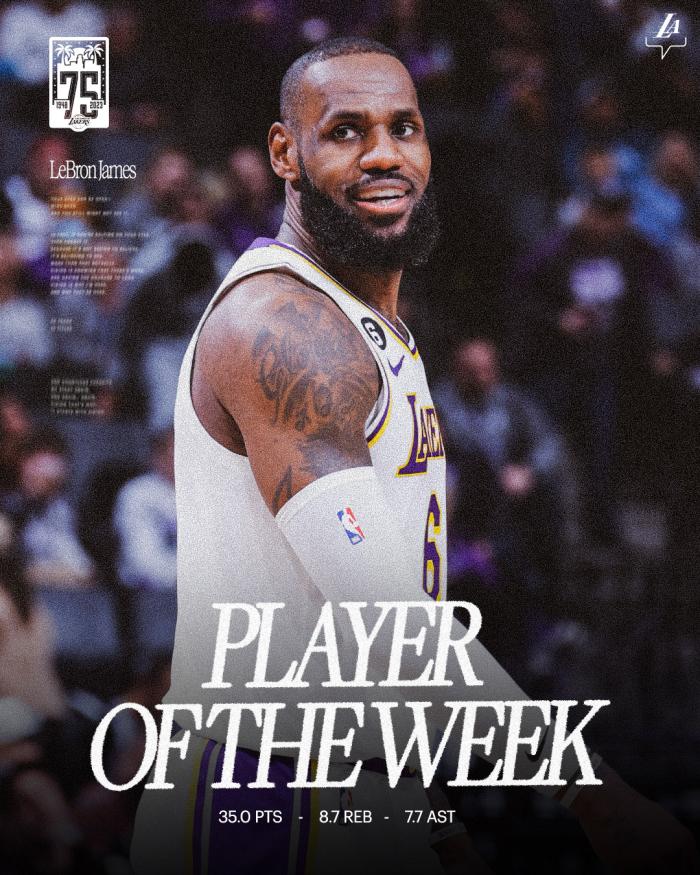 对阵黄蜂拿到43分11篮板6助攻,对阵老鹰拿到25分10助攻7篮板和对阵国王轰下37分8篮板7助攻,詹姆斯38岁后打出不可思议的表现,带队取得连胜并且夺得西部周最佳。