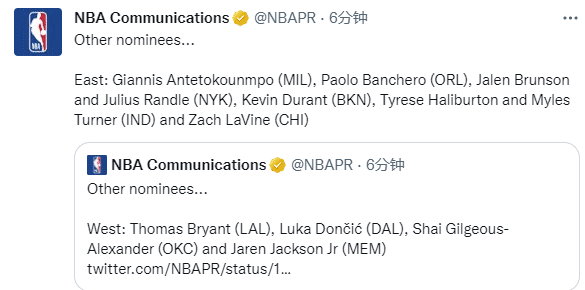 东西部获提名球员东部:字母哥、班凯罗、布伦森、兰德尔、杜兰特、哈利伯顿、特纳和拉文