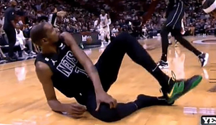 在篮网与热火比赛的第三节,巴特勒持球突破赛斯-库里,上篮时被西蒙斯大帽,巴特勒身体失去平衡并且摔倒,杜兰特不幸遭殃,被巴特勒压伤膝盖;杜兰特穿上鞋子坚持一会后主动要求下场,并且返回更衣室接受检查,因右膝受伤退出比赛。