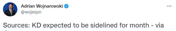 核磁检查之后,篮网公布杜兰特的受伤情况——右膝内侧副韧带扭伤,2周后接受复查;名记Woj跟进报道,KD预计将休战一个月;杜兰特太倒霉,膝盖又被误伤,预计未来一个月都无法出战。
