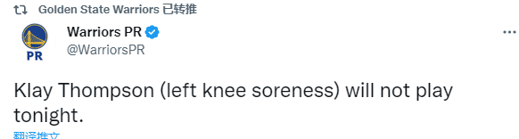 勇士官宣汤普森因伤退赛:左膝酸痛未在替补席 突然变阵悍将临时首发
