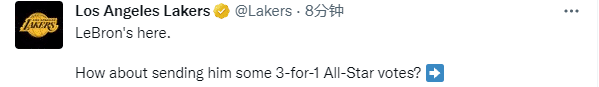 在全明星首轮投票结果中,詹姆斯获得3168694票,力压杜兰特3118545票等球星成为第一阶段票王;今天湖人官方为老詹拉票,今年38岁詹姆斯有望再次成为全明星赛总票王。