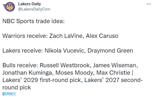 湖人送走威少、克里斯蒂、2029年首轮签和2027年次轮签,得到武切维奇和德拉蒙德-格林