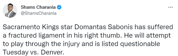 经过与国王队医和外面的专家进行广泛的协商以及进一步的检查,最终小萨的伤情确诊为右手拇指韧带撕脱性骨折;小萨受伤仍拒绝休战,他将尝试带伤出战。
