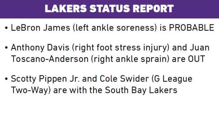 来源:JRS直播网12-25 10:40JRS直播网讯12月25日讯 ,湖人官方公布年终大战对阵独行侠的伤情报告,詹姆斯(左脚踝酸痛)大概率带伤出战,浓眉(右脚应力性损伤)、托斯卡诺-安德森(右脚踝扭伤)缺席比赛,小皮蓬和斯威德都仍旧在发展联盟,继续为南湾湖人效力。