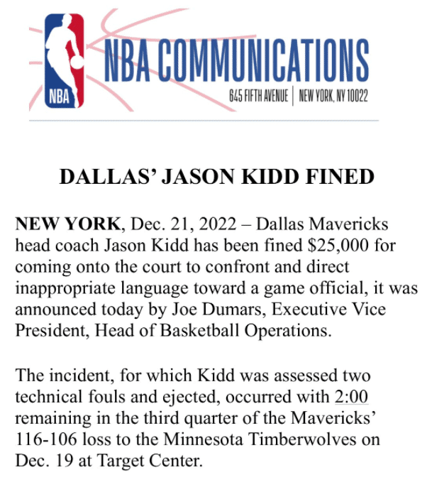 另外,联盟还公布另外一笔罚单,独行侠主帅基德因言语冒犯裁判被罚款2.5万美元,在此前比赛中,基德抱怨裁判而连续吃到两次技术犯规,直接被驱逐离场。