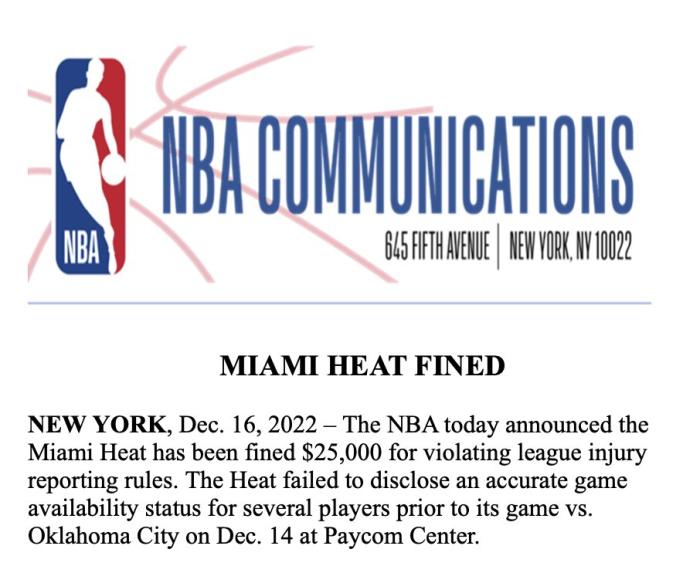 NBA官方宣布热火违反联盟伤病报告规定被罚款2.5万美元,因为热火在12月15日对阵雷霆的比赛中未能正确报告球队伤病情况,此前篮网也曾因此被联盟罚款2.5万美元。