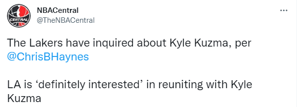 湖人夺冠功臣重返洛杉矶?此前美记者曾报道库兹马想离开奇才,寻求一份年薪2000万美元的新合同;库兹马的生涯从洛杉矶开始,为湖人打了4个赛季,19-20赛季帮助湖人夺得总冠军;不过在2021年休赛期,湖人和奇才达成大交易,为引援威少把库兹马、波普送到华盛顿。