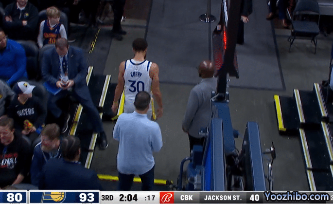 下半场,库里第三节带队19-4疯狂反扑,外线继续开火,内线抢到篮板打成2+1,此时库里打开心了,双手握拳怒吼庆祝,可之后库里不幸受伤,防守切球时导致左肩受伤,捂着肩膀十分痛苦,在队医的陪同下返回更衣室接受检查,之后勇士宣布库里因伤提前退出本场比赛。