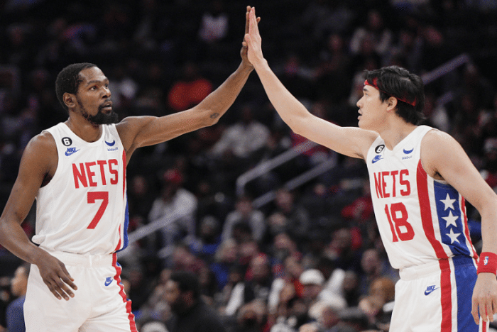 第二节杜兰特休息时,欧文扛起球队的进攻大旗,不讲理2+1、提前变向2+1以及突破空中换手得分,一个人连得11分带队保持领先,期间欧文换手上篮后,杜兰特站在场边为欧文兴奋庆祝;杜兰特回来后外线造犯规三罚全中,篮网双巨半场合砍38分。