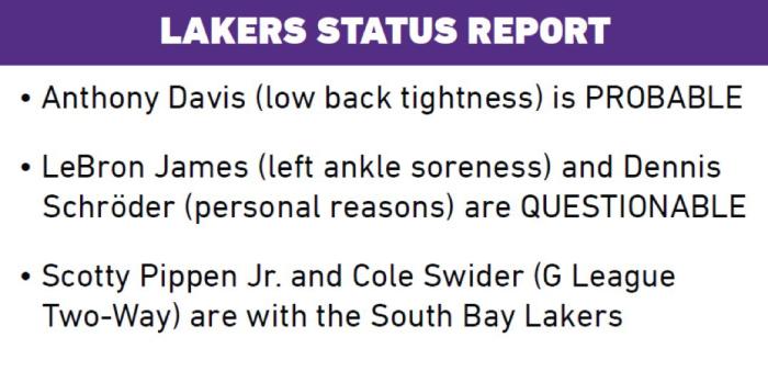 来源:JRS直播网12-04 11:28JRS直播网讯12月04日,湖人官方公布下一场对阵奇才的伤情,浓眉(背部紧张)大概率出战(75%可能性出战)、詹姆斯(左脚踝酸痛)和施罗德(个人原因)出战成疑(50%可能性出战),小皮蓬和斯威德仍旧跟随南湾湖人打比赛。