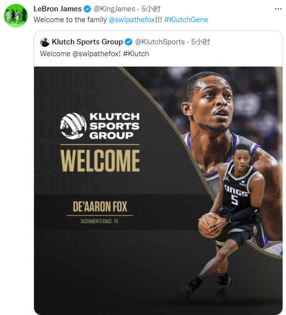 Klutch Sports官方正式宣布,欢迎福克斯加盟,湖人球星詹姆斯则转发推文并且配文写道:欢迎加入Klutch大家庭。