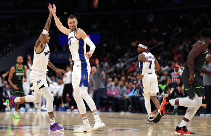 波尔津吉斯开场迎着戈贝尔轰进三分,并且连续命中3记三分,再加上库兹马和比尔输送火力,波神命中个人第4记三分,奇才21-6打爆森林狼,之后狼队反扑,第一节33-38落后5分,波神单节投进4记三分独砍16分2抢断1盖帽,禁区大帽唐斯。