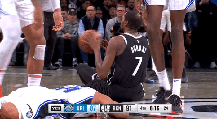 末节,魔术反扑,9分09秒杜兰特重新上场,KD再中三分,再秀无解中投杀招,魔术强行保持悬念,一番对阵最终篮网109-102击败魔术拿下胜利;赛后奥尼尔打断杜兰特采访,和KD拥抱,之后杜欧做出经典的庆祝动作,欧文离场时,KD摸了一下他的脑袋。