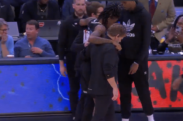比赛进行到第四节还剩3分钟左右时,灰熊已经106-100主场领先雷霆,拿下一场胜利并没有太大问题。但此时意外出现,莫兰特崴脚受伤,并且倒在地上发出惨叫。现场的声音顿时小了许多。之后,莫兰特被搀扶来到场外接受检查,随后被搀扶回到更衣室,并且没有出场。全场比赛,莫兰特拿下19分11助7板。