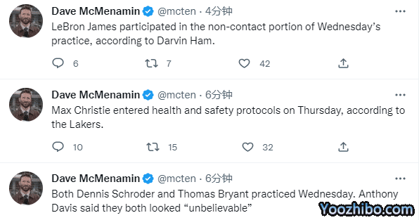 湖人主帅哈姆透露,施罗德和托马斯-布莱恩特今日都参加了球队训练,大概率出战周六对阵活塞的比赛;谈到他们两人时,浓眉表示:他们的状态看起来都非常棒。