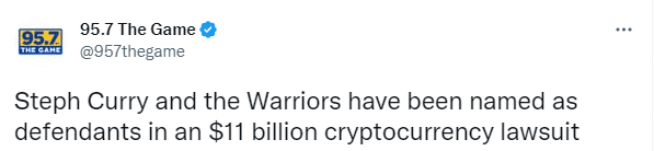 来源:JRS直播网11-17 16:50JRS直播网讯11月17日,勇士队和库里都因FTX破产事件而惹上官司,因欺诈性行为在FTX(加密货币平台)破产引发的集体诉讼中被告上法庭,湖人名宿奥尼尔、NFL巨星汤姆-布雷迪也卷入其中,他们都曾代言宣传FTX。