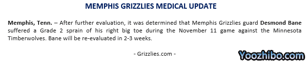 灰熊官宣:贝恩右大脚趾二级扭伤至少伤停2-3周 莫兰特折损一大帮手