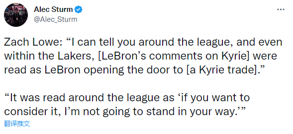 对此,名记扎克-洛维表示:我不知道为什么勒布朗昨天那么说欧文,他说是时候让欧文重回联盟了。也许他这么说只是因为他就是那么想的,没有别的含义。我可以告诉你,在整个联盟,甚至在湖人内部,这些评论被解读为勒布朗打开了一扇门,至少打开了一扇门,‘嘿,如果你们都愿意接受这样做,以及接受它会带来的所有负面影响,篮网现在愿意接受抛售欧文的生意,这样我们就可以以更低的价格得到他,不是付出两个选秀权,也许是一个选秀权;这被全联盟解读为勒布朗在暗示,‘如果你们想考虑一下欧文的交易,我不会阻挡你们的。