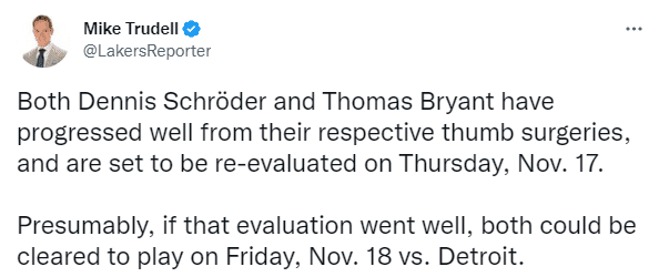 据湖人记者Mike Trudell报道,施罗德和托马斯-布莱恩特球队两位伤员都在本周接受了复查,并且在各自的康复训练中都进展顺利,他们都将在11月18日接受重新评估;如果评估进展顺利,两人都可以在11月19日星期六对阵底特律活塞的比赛中上场。