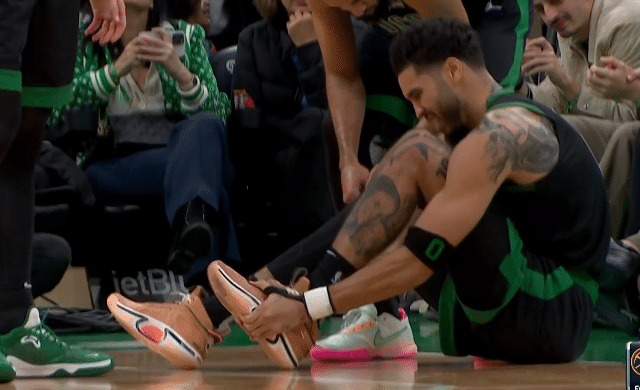 第四节9分57秒,塔图姆迎着小波特的防守远投三分,落地时踩到了小波特的脚,脚踝崴了一下,坐在地板上活动脚踝,裁判回放之后,升级吹罚小波特垫脚一级恶意犯规。