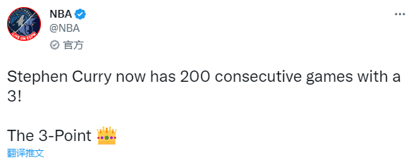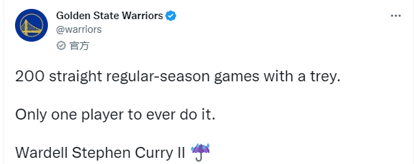 NBA官方祝祝贺库里,勇士官方第一时间高呼库里全名庆祝,发推写道:库里在常规赛连续200场投进三分球,史上仅有一人做到,他就是沃德尔-斯蒂芬-库里二世。