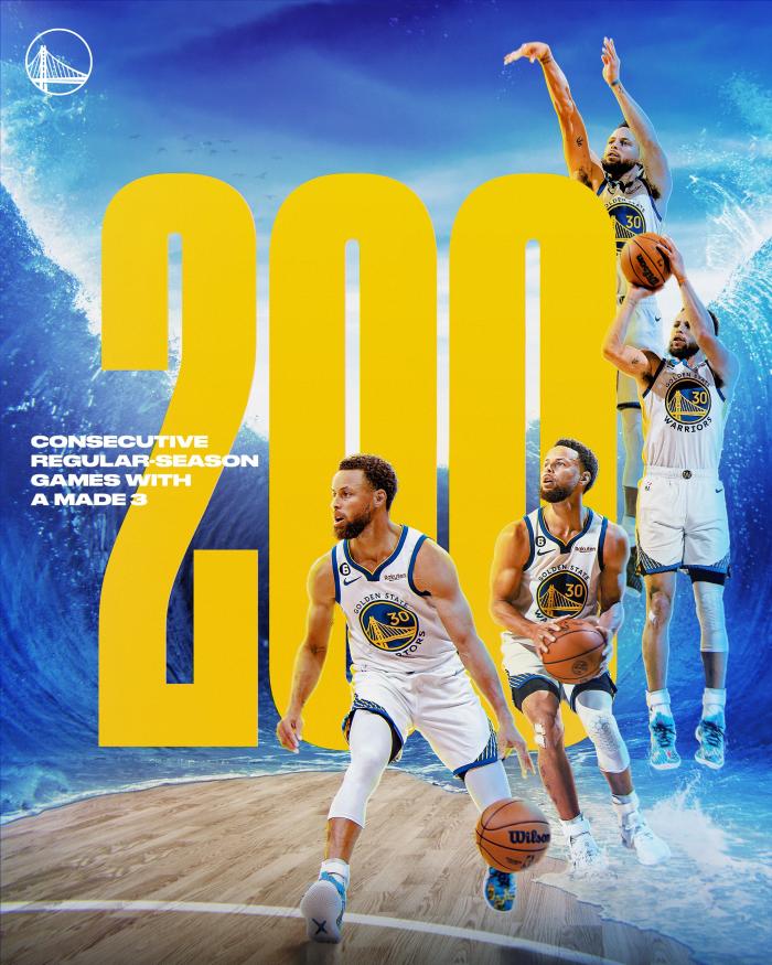库里又创历史第一神迹:连续200场投进三分 勇士官方高呼其全名庆祝