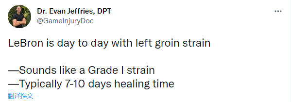 医学专家Evan Jeffries表示詹姆斯因左腹股沟受伤进入每日观察名单,听起来像是一级拉伤,一般需要休战7-10天。
