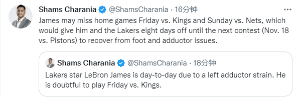 名记shams发推写道:詹姆斯或将连续缺战此后对阵国王和篮网的比赛,由于赛程上的安排,詹姆斯可能借此得到八天的休息、恢复时间,这足以让他从足部、内收肌的伤病中康复。