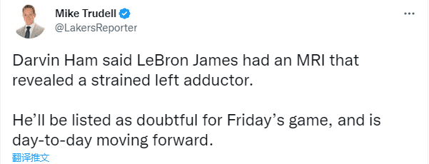詹姆斯接受了核磁共振检查,哈姆表示詹姆斯遭遇左内收肌拉伤,但没有任何撕裂的情况,这与他在2018年圣诞节遭遇的腹股沟伤势有本质上的不同,詹姆斯因伤进入每日观察名单,下一场对阵国王,詹姆斯被列为大概率缺战(75%可能性休战)