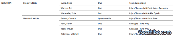 尼克斯球员米切尔-罗宾逊(右膝扭伤)、亨特和基尔斯被下放到发展联盟,格兰姆斯(左脚酸痛)出战成疑。