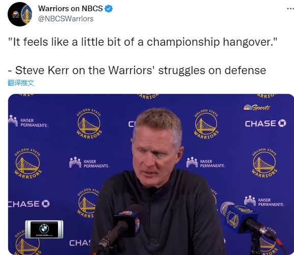 赛季至今,勇士9战仅仅拿到3胜6负而且遭遇客场4连败,勇士战绩糟糕的最大原因就是防守太糟糕,据统计,勇士队场均失分高达122.2分,排名联盟倒数第一;对于球队挣扎的防守,科尔表示这感觉有点像总冠军的宿醉(醉酒仍未清醒)后遗症;早期的一些惨败可能正是这个竞争激烈的群体所需要的,可以点燃我们的斗志。