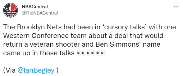 据纽约记者Ian Begley报道,在上周日输给步行者之前的几天,篮网曾和西部的一支球队进行过粗略的谈判,本-西蒙斯的名字出现在交易谈判之中,他们希望换回一名老将射手;目前还不清楚谈判进展如何,但篮网想要引援外线射手。