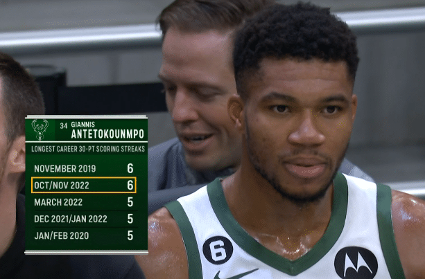 1、字母哥本赛季连续6场得分30+追平生涯纪录