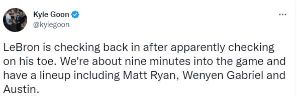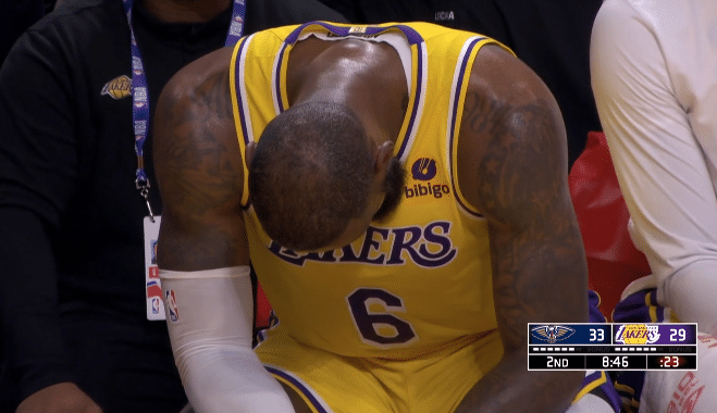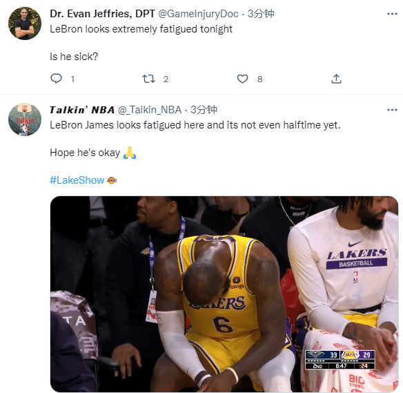 第二节8分40多秒,詹姆斯被换下场,走起路来显得十分疲惫,坐回替补席后他低头不语、气喘吁吁,整个人都显得很累;对此,美媒Talkin NBA发推写道:勒布朗-詹姆斯看起来很疲惫,半场还没打完呢;医学专家Evan Jeffries也表示詹姆斯今晚很疲惫,难道他生病了吗?看起来他像再和某种疾病作斗争。