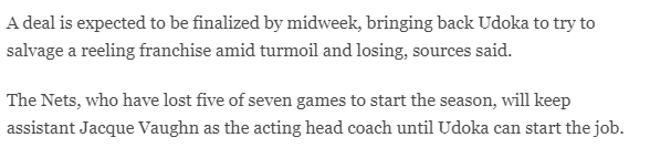 据报道,乌度卡已经非常接近成为篮网的新任主教练,双方预计会在本周中达成协议。